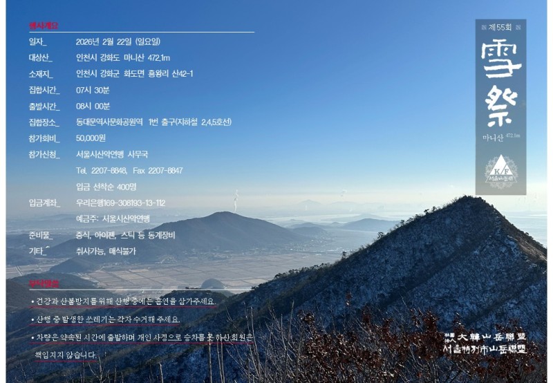 서울특별시산악연맹은 2026년 제 55회 雪際를 아래와 같이 진행합니다.