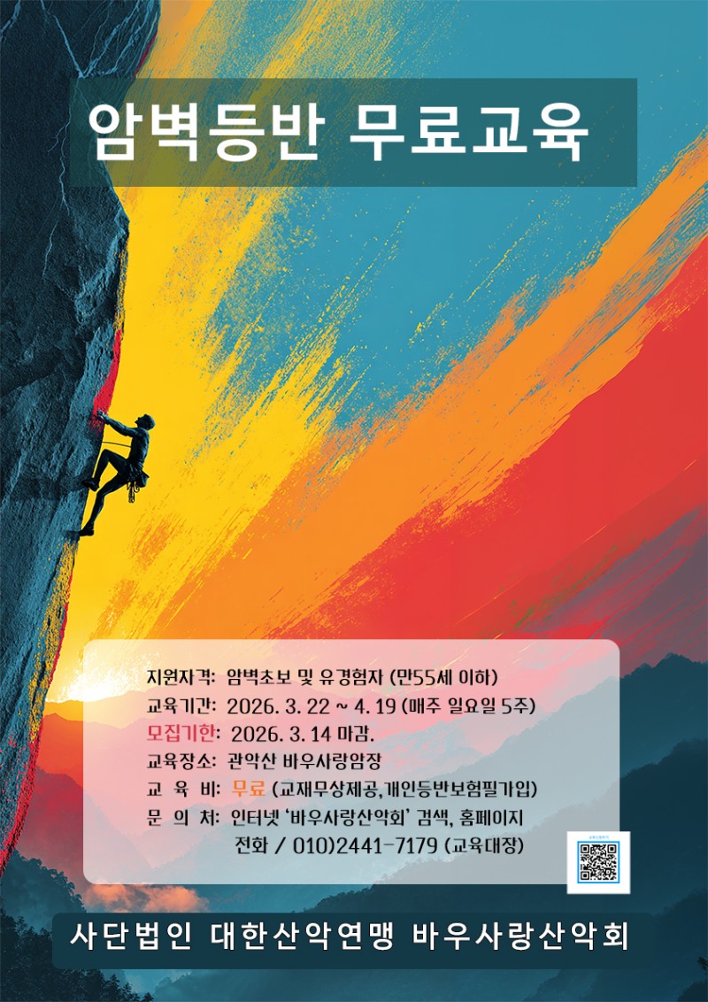 초보자 대상 암벽등반 무료교육 안내 작성자 정보 바우사랑산악회 작성 28 조회 작성일 2026.03.03 15:01 컨텐츠 정보 본문 암벽등반 입문자들을 위한 안전하고 즐거운 멀티피치 시스템 등반 교육입니다 SNS 공유 관련자료 다음 대한민국 ROTC 중앙회 산악회 2월 산행 - 자작나무 숲 작성일 2026.02.10 댓글 0개 등록된 댓글이 없습니다. 로그인한 회원만 댓글 등록이 가능합니다. 목록