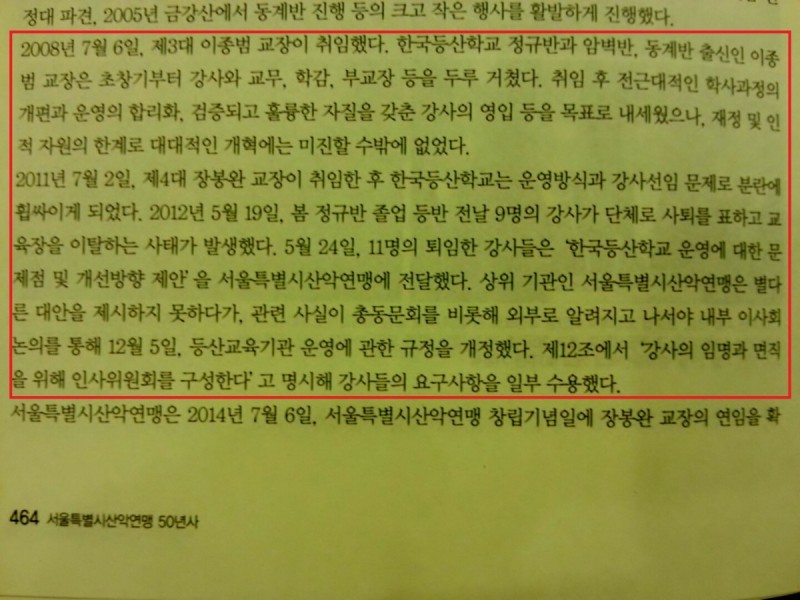 50년사 편찬위원회에서는 한국등산학교 소개하는 464쪽의 이부분에 대해서 어떠한 근거와 정확한자료를 가지고 기록하였는지 답변하여 주십시오