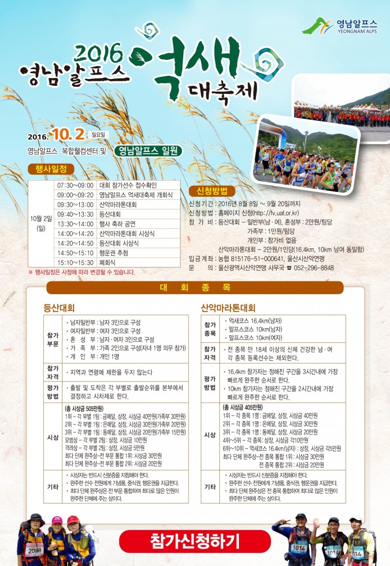 2016 영남알프스 억새대축제 작성자 정보 울산연맹 작성 4,085 조회 작성일 2016.08.14 12:52 컨텐츠 정보 본문 . SNS 공유 관련자료 이전 제2회 울주군수배 전국 스포츠클라이밍대회 작성일 2016.08.16 다음 스포츠클라이밍 2020 도쿄올림픽 정식종목 채택 작성일 2016.08.04 댓글 0개 등록된 댓글이 없습니다. 로그인한 회원만 댓글 등록이 가능합니다. 목록
