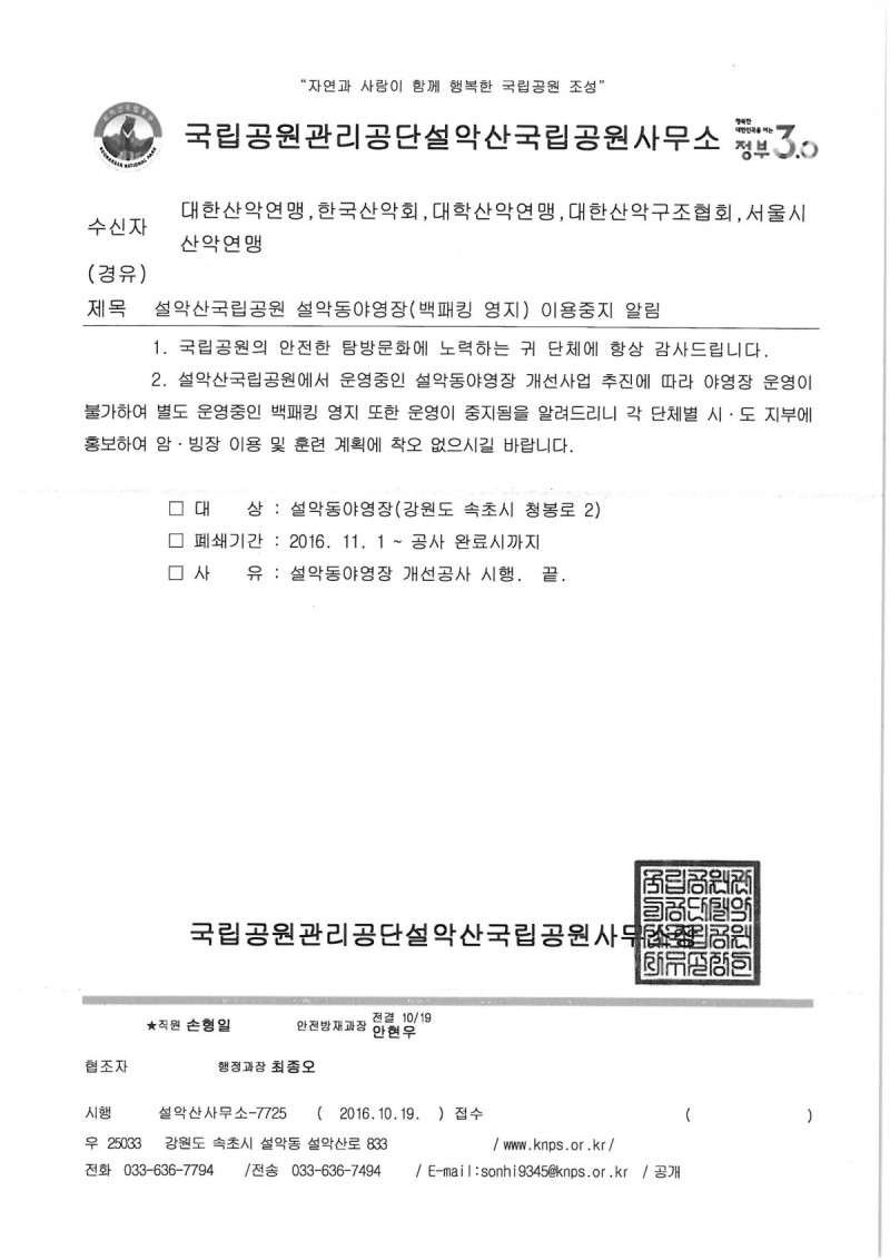 설악산국립공원 설악동야영장 이용중지 알림 작성자 정보 서울연맹 작성 4,552 조회 작성일 2016.10.25 10:32 컨텐츠 정보 본문 (설악동야영장 이용 중지 알림) 설악산국립공원에서 운영중인 설악동야영장 개선사업을 추진함에 따라 야영장 운영이 불가하여 운영이 중지됨을 알려드리니 각 구협회 단체 및 가맹단체는 훈련 계획에 착오 없으시길 바랍니다 대 상 : 설악동야영장(강원도 속초시 청봉로 2) 폐쇄기간 : 2016. 11. 1 ~ 공사 완료시까지 사 유 : 설악동야영장 개선공사 시행, 끝. SNS 공유 관련자료 이전 한국산서회 창립30주년 기념식및 심포지움 작성일 2016.10.27 다음 한국산서회 창립30주년행사 초대장 작성일 2016.10.22 댓글 0개 등록된 댓글이 없습니다. 로그인한 회원만 댓글 등록이 가능합니다. 목록